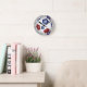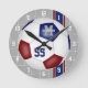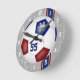 This sporty team colours soccer themed clock features the realistic image of a soccer ball upon which you can customize the athlete's name, monogram and jersey number - the soccer ball's typically black panels have been recolored maroon & blue - the background is customizable light grey with overlying goal net accent graphic, vertical blue & maroon varsity stripes and white clock face numerals - by katz_d_zynes