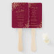 These beautiful hand held fans are designed to serve as both cooling for your guests, and a wedding program. The elegant design features gold script calligraphy on a maroon or burgundy red background with ornate golden faux foil lace frills in the corners. There is space to list the ceremony order as well as the wedding party and a short thank you note. Wonderful memento of your special day.