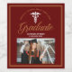 This chic maroon and gold custom medical school graduation party photo wine label for a nurse or doctor features classy white typography under a medical caduceus and your college name for the class of 2024. Customize with your graduating year under the elegant calligraphy for a great personalized university graduate gift.