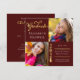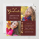 Elegant and classy square maroon and gold tone, two photo graduation announcement and party invitation design. Features the word "Graduate" in scripted gold tone text art and the year "2025" in vertical gold tone text art on the front with your photos in opposite corners. Fields are provided for the graduate's name, graduation date, school, college or university and future plans on front. On back is a coordinating graduation party invitation design, also with gold tone accents. Design by Holiday Hearts Designs (rights reserved).