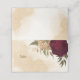 Beautiful wedding place card featuring maroon and beige gold flowers with green leaves .