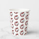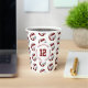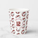 These volleyball themed birthday party paper cups feature multiple small maroon, grey & white volleyballs arranged in a simple drop pattern - text on a white circle graphic can be customized, currently 12 to represent a child's age encircled by the words, "Happy birthday" - by katz_d_zynes