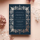 An elegant bridal shower invitation for Moroccan, glam, deco, or Gatsby themed bridal showers featuring an ornate Moroccan style border in rose gold foil, with classic lettering on a rich navy blue background.