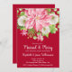 Christmas holiday theme day after the wedding brunch and bubbly invitations feature a large pink poinsettia, winter flowers, pines and holly leaves on a red background and your details in chic white lettering. MATCHING items in our store.