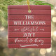 A keepsake of your farmhouse wedding to celebrate your first married Christmas and to treasure each holiday season to come. Rustic red barn wood with natural patina in the background. Your family name, established, and the year all in distressed text that adds to the weathered look. "Married and Merry." Add your favourite photo to this personalized square red barnwood ornament.