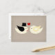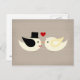 A very cute card featuring a canary-bird bride and groom in traditional vintage wedding attire - with a red heart between them, placed against a sepia coloured striped background.