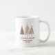Seasonal festive mug design features an elegant display of snowy Christmas trees in red, gold & pink on a transparent background. Below the trees, section "Married & Merry" is featured in elegant classic typography. Add the couple's first names & special date or two lines of custom text in matching red script with the simple-to-use template. Please message or email beachpausedesigns@gmail.com for further customizations.