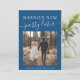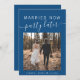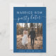Modern classic blue elopement or smaller wedding announcement card to let family and friends know that your wedding plans changed, requiring you to elope or reduce the number of guests at your wedding to a small intimate group, but that you will host a celebration party or reception in the future. The front features your photo and "Married Now, Party Later" in a mix of simple white typography and a trendy white script with swashes. Under your photo, add your first names and wedding date. On the reverse, personalize your message in more detail and add your names in a signature script.