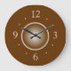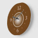 Une horloge marron clair avec un centre à effet de lueur blanche. Ce design simple a de grands chiffres pour correspondre. Disponible en formes rondes et carrées. Parfait pour votre cuisine, salle à manger ou comme cadeau pour une occasion spéciale.