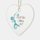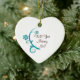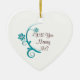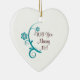 Surprise and thrill her or him with this beautiful white ceramic heart shaped marriage proposal ornament that pops the question "Will you marry me?" Designed with image of an aqua coloured filigree flower and tiny faux diamond accents and chocolate coloured text on a clean white background. The back side can be personalized with further text, date etc.. A special gift and keepsake of a memory that will be treasured for years to come.