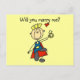A stick figure prince gets down on one knee with an engagement ring in hand and text reads "Will You Marry Me?" on stick figure Wedding Proposal T-shirts, mugs, cards, stickers, mousepads, magnets, buttons, and more. Surprise her and ask her hand in marriage with the help of this cute stick figure T-shirt, button, mousepad, card, or other item!