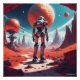 A lone astronaut stands on a rocky alien landscape, gazing up at a massive robotic structure with a clear dome and mechanical legs. Multiple planets are visible in the sky, creating a striking scene of space exploration.