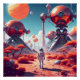 A lone astronaut stands on a rocky alien landscape, gazing up at a massive robotic structure with a clear dome and mechanical legs. Multiple planets are visible in the sky, creating a striking scene of space exploration.