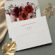 Present your wedding invitations with an added touch of elegance using this matching envelope set. The front features a stunning watercolor floral design spilling over the top, highlighted by rich marsala, soft peach, and delicate cream hues, complemented by cool grey foliage. The back flap of the envelope carries a simple, refined print of the couple's names, offering a personal touch to this exquisite stationery. Ideal for any season, the colour scheme particularly enhances the warmth of fall weddings and the rich, cozy tones of winter celebrations.