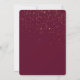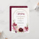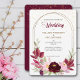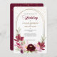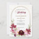Un cadre double en or ovale est décoré de roses et de feuilles marsala rouge et rose au fond de ce joli faire-part de mariage. Votre texte personnalisé est en gris vert, or, et le rouge correspondant au centre. Le tiers supérieur a également un spray de confetti en or brillant. Les images et le texte sont placés sur un élégant arrière - plan blanc. Le dos de l'invitation est assorti rouge profond, avec la même superposition de confettis. Belle, moderne et chic ! Les couleurs de cette invitation sont adaptées à chaque saison. *Merci à LABF Creations pour les images florales de ce design.