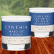 These personalized Marseille Bleu wedding whiskey glasses can be customized as wedding guest favours for everyone at your celebration or make excellent bridal party favours and thank you gifts. A double sided design allows you to add separate text, front and back. The modern design of a luscious shade of navy blue paired with a soft ecru is the backdrop for adding CHEERS! or WELCOME and in the smaller font below, BEST DAY EVER or TIME TO CELEBRATE etc. For bridal party gifts, use the larger white font for the first name of each wedding party member and the smaller font just below for your wedding party member's titles such as bridesmaid, groomsman, best man or mother of the bride. Dark blue text on the lower ecru portion is the perfect place to add the names of the bride and groom and the wedding date. The reverse side of these custom wedding whiskey glasses has up to four lines in white on the navy blue where you can add something like THANK YOU FOR CELEBRATING WITH US or your own short message, while the bottom blue text on ecru can be a simple WITH LOVE AND THANKS and the bride and groom's names again.