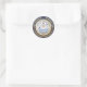 The national seal or coat of arms of the Marshall Islands, is set on a white background. The emblem is infused into a faux gold circle shape, and that, in turn, is nestled in the middle of a faux gold laurel wreath.