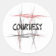 Martial Artists are known for their courtesy and politeness. Show how important this tenet or virtue is in your life with these Martial Arts Courtesy Stickers. They make a unique martial arts gift for a birthday, holiday or belt rank promotion test. Background design of these motivational custom martial arts stickers is a black,red and grey fractal art design.