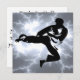 Square party invitations for Martial Arts theme parties feature a male Martial Artist in black silhouette on a lightning background. Offered here in silver, it is also available in other colours including orange, green, purple, blue and bronze at our main store MartialArtsPartyStore dot com. Back has fill in lines for your party or event details. These are a great choice for inviting guests to a black belt achievement congratulations party.
