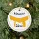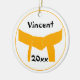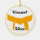 Personalize the unique Martial Arts Orange Belt Round Ornament with the name of your martial artist athlete and current year to commemorate a belt rank promotion test, birthday or holiday. This one of a kind custom martial arts sports ornament features a digitally enhanced photograph of a martial arts belt tied in a knot with a white background.