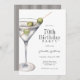 A sophisticated birthday party invitation with a chic stylish cocktail theme featuring a martini with 3 olives. Shown here as a 70th birthday party, you can personalize the text template for any age. All of the text may be personalized for your party. This invitation is available as printed and paperless digital download for sending to your guests electronically.