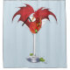 A cute small red dragon is snuggling up to a green olive in a martini glass