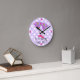 Whimsical wall clock done in a lavender and white polka dot pattern. Graphics two colourful polka dot martini glasses, decorates the middle, and four pink buttons denotes the quarter hours. Black text, at the bottom of the clock, reads Is It Happy Hour Yet? Fun clock that makes a great gift idea.