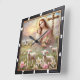 This serene square wall clock portrays the Virgin Mary holding the child Jesus, surrounded by gentle lambs in a peaceful countryside setting. A church and a crucifix are visible in the distance, completing this tender and spiritual scene, symbolizing divine love and innocence.