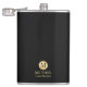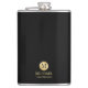 This flask features white monogram in gold circle element with name and title in gold professional font style on black background.