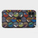 This phone case has a mid-century modern design of oval halves, some solid and some striped, in masculine colours on a field of dark grey.