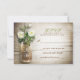beautiful rustic wedding reply cards with distressed wood background and mason jar with white flowers . I suggest a beautiful linen texture paper for this design.
