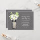 Perfect for a country style wedding or maybe you just love Mason Jars! Mason Jar hanging on a hook filled with country wildflowers. A Cool Charcoal Grey background against the hanging Mason Jar and wildflowers in colours of light green and white daisies. If you have any questions on this design or want a colour change please email me paula@labellarue.com Also check for the RSVP, RECEPTION and GUEST SEATING Cards to match!