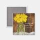 Announce your upcoming casual yet classy farm or ranch theme nuptials with the charming Mason Jar and Yellow Daisies Country Barn Wedding Save the Date Square Magnet. This informal and elegant custom rustic chic nuptial keep the date magnet features a quaint digitally enhanced floral photograph of a glass canning jar filled with yellow daisy flower blossoms and a brown weathered barn wood background.
