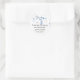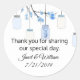 Pretty round wedding favour sticker done in white, with graphics of white and blue mason jars, hanging off a blue coloured blossoming tree limb. Personalize the text for your wedding. Matching products are available.