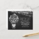 Chalkboard save the date postcard with mason jar full of wildflowers, daisies, leaves and love hearts and glowing twinkle lights hanging on the wire. Romantic and rustic cute slate grey chalkboard save the date postcards with big love heart and bride's and groom's initials in it.