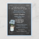 Popular chic, vintage chalkboard look, Baby shower invitation in blue. Rustic country mason jar filled with pretty blue flowers, blue and chalkboard look background print and text. Baby shower invitation is personalized. Add matching products. Please visit my store "The Hungarican Princess" at www.zazzle.com/hungaricanprincess*. Look in my "Oh Baby" department category. Congratulations! The "blue colour" hex # is BFE4FF.