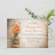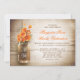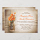 de belles invitations de mariage rustiques avec arrière - plan en bois en détresse et bocal en maçon avec fleurs couleur orange. Je suggère un beau papier de texture de lin pour ce design.