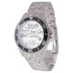 Has heft and feel of expensive stainless steel quartz watches. Good band with safety catch. I removed links, which is easy because engraved arrows show direction to push the linking pins. As always by this seller, the image (a railroad logo) is a perfect reproduction of my emailed image, and is precisely spaced and aligned.