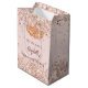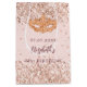 A gift bag for a girly and glamourous 21st (or any age) masquerade themed birthday. A rose gold gradient background with rose gold, blush confetti and a masquerade mask. Personalize and add a date, name and age 21. The name is written in dark rose gold with a modern hand lettered style script.