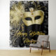 Masquerade birthday party backdrop with beautiful gold masquerade mask on a pretty black, gold and white bokeh background. This beautiful black and gold masquerade party backdrop banner is easily customized with the text of your choice. You can change the background and text colour.