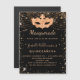 For an elegant Masquerade, Quinceañera, 15th birthday. A stylish black background. Decorated with faux gold glitter dust and a masquerade mask. Personalize and add a name, age and party details. The name is written with a hand lettered style script