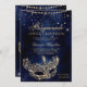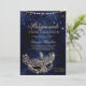 A modern, chic and glamourous sweet sixteen with a hand drawn gold glitter masquerade mask with rose gold glitter diamond sparkles on a dark navy blue watercolor background.