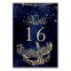 Masquerade mask table number chic yellow gold glitter sparkles with dark blue watercolor, a hand drawn luxurious gold mardi gras mask with gold diamonds glitter confetti. Perfect for birthday party, masquerade ball or weddings.