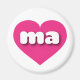 This magnet features a vibrant hot pink heart containing the bold, white, rounded lower case letters ma, a playful abbreviation for Massachusetts, the bay state.