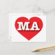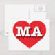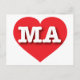 This postcard features a vibrant red heart containing the bold, white, upper case letters MA, the official abbreviation for Massachusetts, the bay state. The reverse side of the postcard is blank, awaiting your handwritten sentiments or customized text.