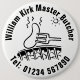 Butcher Shop button badge with your choice of company name and phone number. Illustration shows a sausage on a fork.