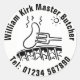 Butcher Shop sticker with your choice of company name and phone number. Illustration shows a sausage on a fork.
