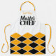 Geometric mosaic pavement style patterned print all over elegant apron in orange peach, white, and black with a bold MASTER CHEF typography script.+++++++++++ You can personalize it with your name. ++++++++ It can be a nice gift for a cooking lover or a master chef - husband, friend, fiancee, or employee.