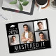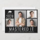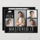 Modern masters degree black graduation announcement card featuring a 4 picture photo collage, "Mastered It" written in large capital white letters and the grad's class year, name and school or university in simple white typography. On the reverse side, add an additional photo and a personalized message.