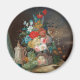A still-life magnet of a colourful arrangement of flowers in a glass vase and a selection of fruit on a marble pedestal. The flowers include roses, lilies, and tulips, while the fruit includes grapes, peaches, and plums. The painting is by 19th-century Austrian artist Eduard Wuger.
